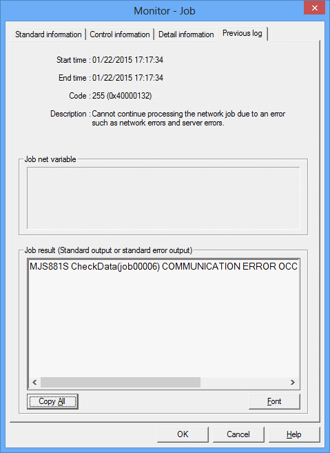 When the job is completed, the meaning of the Code will be explained here. However, this will not be displayed for child or linked job nets.