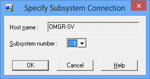 When operating multiple subsystems, specify the destination host name and user ID in the Print Jobscheduler Info [Login] window to display the Specify Subsystem Connection window. Specifying a subsystem number here displays the Print Jobscheduler Info window.