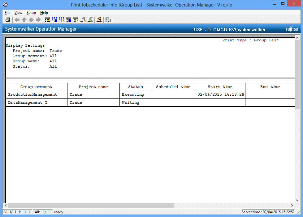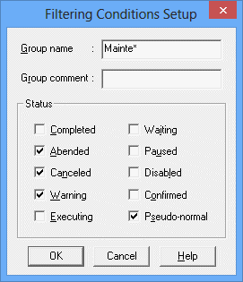 Specify the filtering conditions in the Filtering Conditions Setup window, then click OK. The group list print image in the Print Jobscheduler Info window will be refreshed according to the specified filtering conditions.