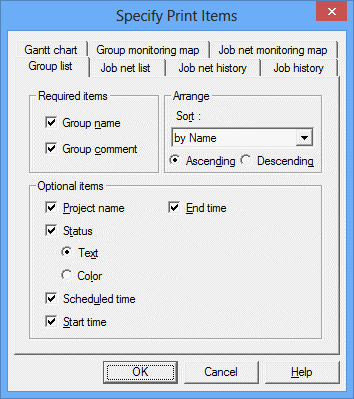 Specify the output items in the Group list sheet of the Specify Print Items window, then click OK. The group list print image in the Print Jobscheduler Info window will be refreshed according to the specified print items.