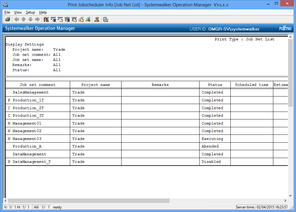 Specify the filtering conditions in the Filtering Conditions Setup window, then click OK. The job net list print image in the Print Jobscheduler Info window will be refreshed according to the specified filtering conditions.