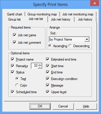 Selects the output items (Project name, Remarks, Status, Scheduled time, Estimated end time, Start time, End time, Executing condition, message, Upper level) to be displayed in the job net list.