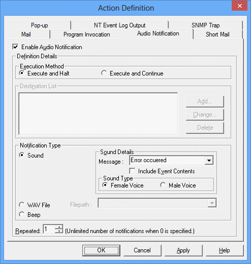 Information on the audio notification destination. It is normally grayed out, as it is available only when Systemwalker Centric Manager is installed.
