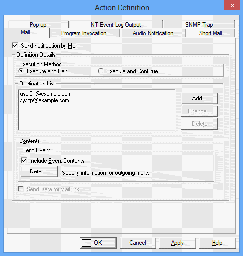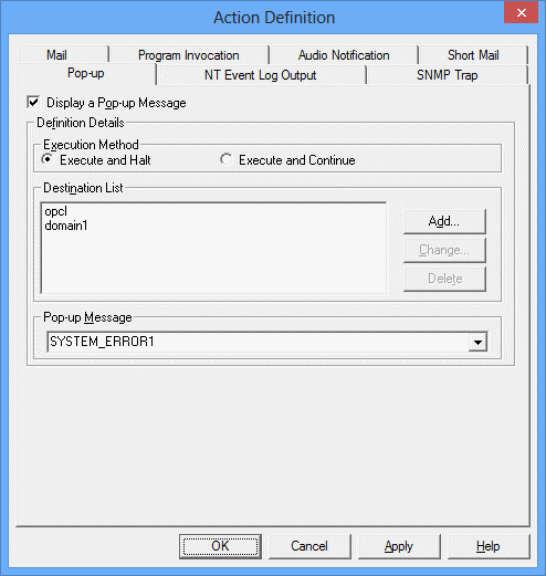 Changes an already-registered notification destination of pop-up messages. Clicking Change displays the Add Destination dialog box.