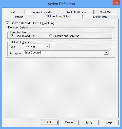 Figure 11.12 Action Definition dialog box - NT Event Log Output sheet