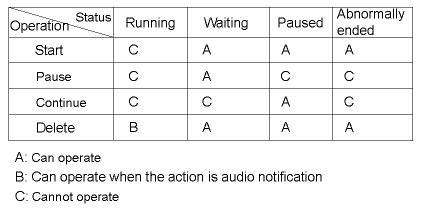 The following shows the operations that can/cannot be carried out for each action status.