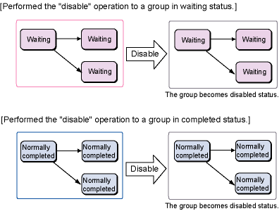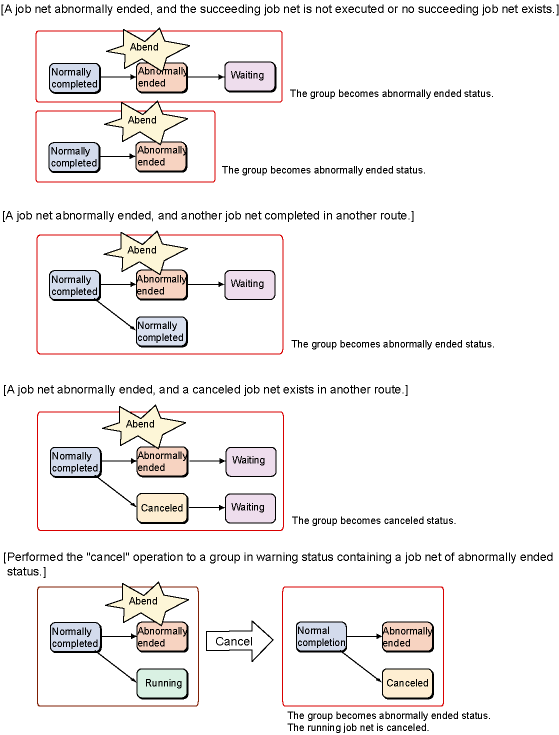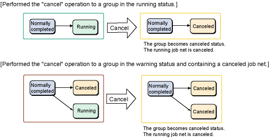 If the cancellation operation has been executed to the group, the group will be in the cancelled status. However, if any abended job net exists in the cancelled group, the group will be in the abended status.