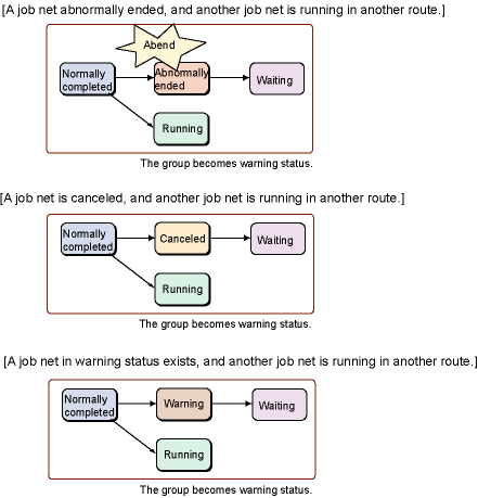 The group is considered to be warning when the group is in execution and any warning, abended or cancelled job net exists in the group.