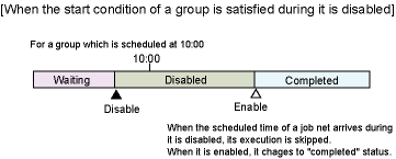If the startup time comes while the group is in the disabled status, it will be skipped and will be in the pseudo-normal status.