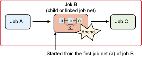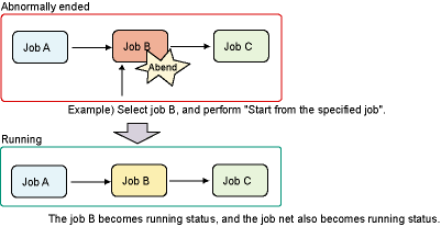This operation is available only for the jobs with job net or linked job net icons. The specified job will be restarted and be in the executing status. When the job is completed normally or pseudo-normally, the succeeding job will be executed.