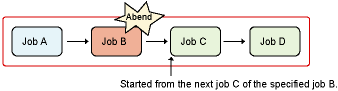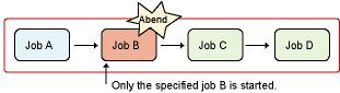 This is an operation to start the jobs which remain in the abended or cancelled status as a result of carrying out "Start from Next Job." Therefore, this operation is not available for the jobs with no succeeding job or the jobs for which the succeeding jobs are in the waiting status (including the jobs which are in the paused or disabled status and are previously in the waiting status) including the recovery jobs.