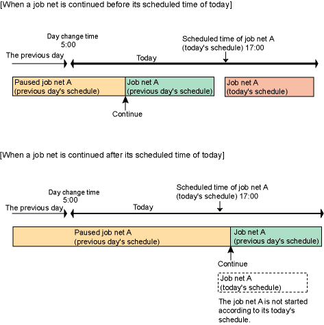 If resumed before the scheduled execution conditions for the current day are satisfied, the job net will be executed at the same time when the continue operation is executed. The job nets scheduled for execution for the current day will be in the waiting status and they will be executed when the execution conditions are satisfied.