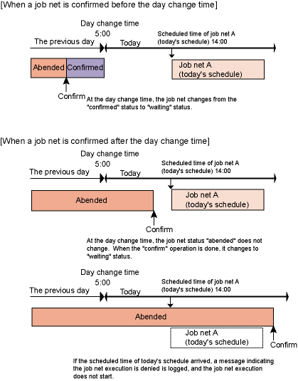 However, if an abended job net is scheduled for the current day execution before executing the confirm operation, the execution reject message "refused" will be output to the log file jobdb*.log and the job net will not be executed.