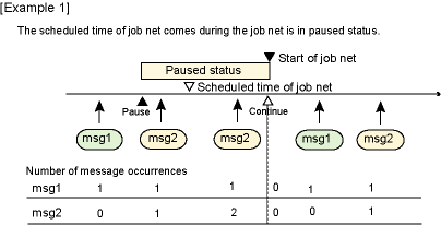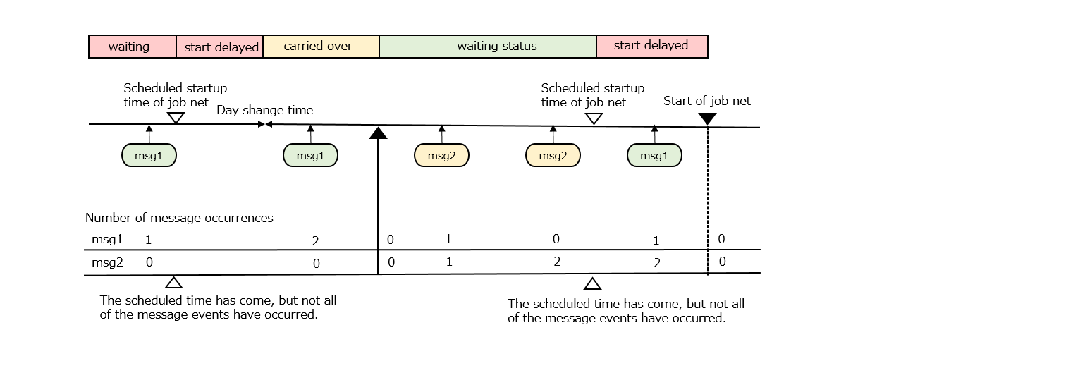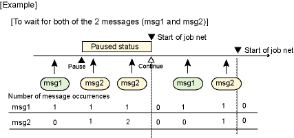 Here is an example in which the job net is started when both msg1 and msg2 have occurred and the startup time has come. Suppose the job net was in the waiting status before it was brought into the paused status.