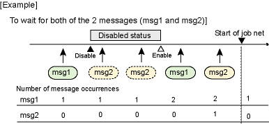 Here is an example in which the job net is started when both msg1 and msg2 have occurred and the startup time has come. Suppose the job net was in the waiting status before it was brought into the disabled status.