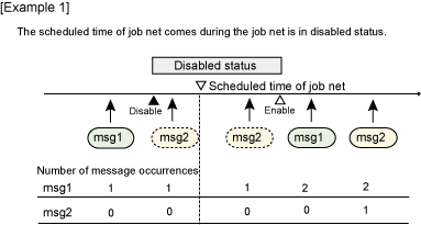 The message event occurrences are not counted while the job net is in the disabled status. If the job net is disabled while msg1, which has occurred before the disable operation, is counted, the job will be started after the job net is enabled and msg2 is notified.