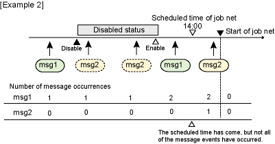 In the example below, the message event occurrence conditions will not be satisfied even when the startup time comes after the enable operation, because msg2 is not counted while the job net is in the disabled status even though msg1 is stored. The job net will be started and the message event count will be cleared when the message event occurrence conditions are satisfied.