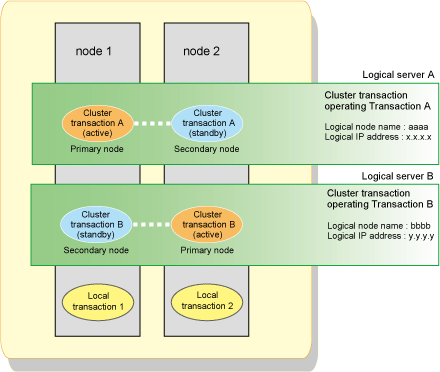 AdvancedCopy Manager can perform local disk (i.e., not in cluster operation) backup/replication with a cluster operation machine. A transaction where such a local disk backup/replication operation is performed is called a local transaction. The local transaction does not switch over to another by failure. For local transactions, set this local transaction to perform local volume backup/replication that is not included in a cluster transaction. When operating the backup/replication that is not included in a cluster transaction, set the backup/replication to the local transaction.