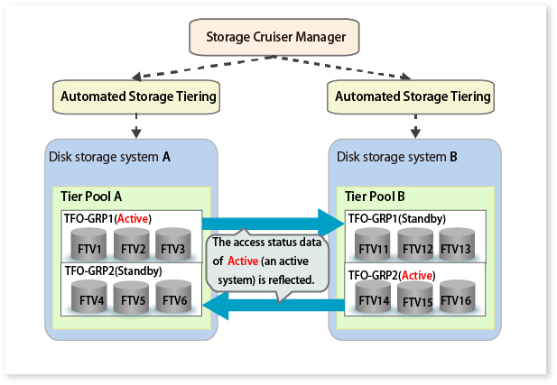 When setting the FTV as the synchronization target volume using the Storage Cluster function, the access status data of the Active side FTV and the Standby side FTV are synchronized. This process is referred to as "access status data synchronization". With this process, evaluation/relocation that was optimized for the I/O access status from the Active side FTV is possible even for the Standby side FTV, and enables operations for maintaining pre-failover access performance even after a failover.