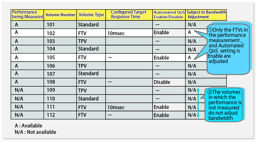 In this example, among the volumes that are targets for performance management, only the two volumes (volume numbers 102 and 105) that are enabled (Enable) with Automated QoS become targets of a bandwidth adjustment by using the Automated QoS function.