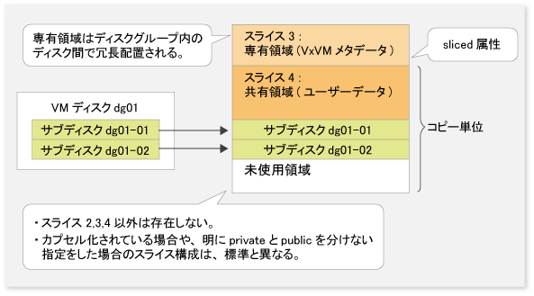 AdvancedCopy Managerは、論理ボリュームのコピーをサブディスク単位でなく、sliced属性(専有領域と共有領域が分離)を持つVMディスク(物理ディスク)の共有領域全体をコピーすることによって行います。