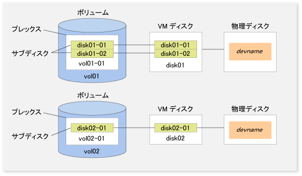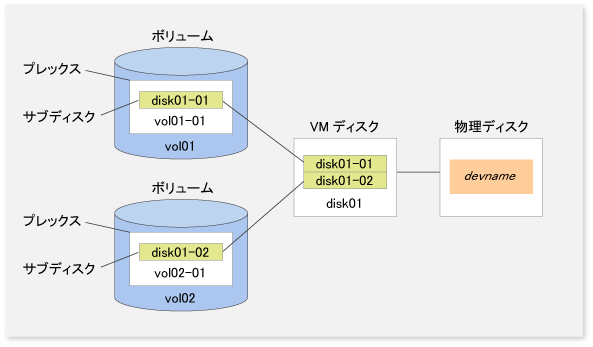 図1.2 ボリューム、VMディスク、物理ディスクの関係(1)
