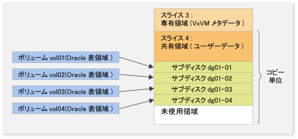 AdvancedCopy Managerは、VMディスク全体をコピーするため、サブディスクとなる共有領域だけでなく、VxVMの内部構成情報が格納されている専有領域もコピーされます。