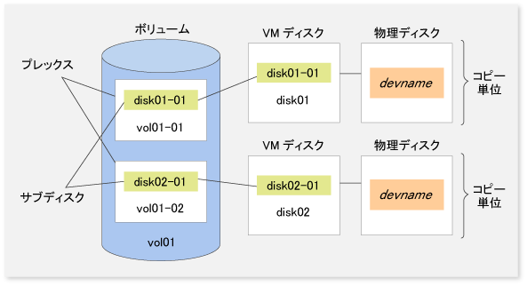 AdvancedCopy Managerでは、以下の単位でVxVM配下のボリュームをバックアップ/レプリケーションできます。