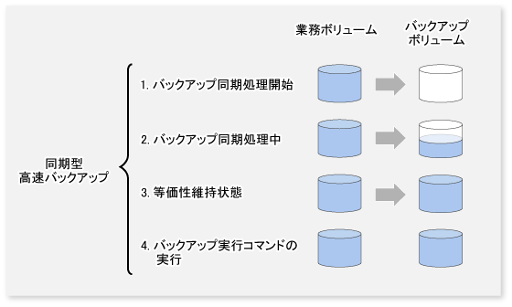 バックアップ同期処理による全面コピーが完了し、業務ボリュームとバックアップボリュームの等価性を維持するための状態(等価性維持状態)になります。(図の3)