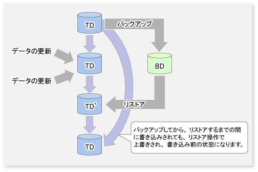 最新のバックアップボリューム採取時点と、リストア操作を行うまでの間に、業務ボリュームの内容を書き換えたとしても、書き換えられたデータは保証されません。