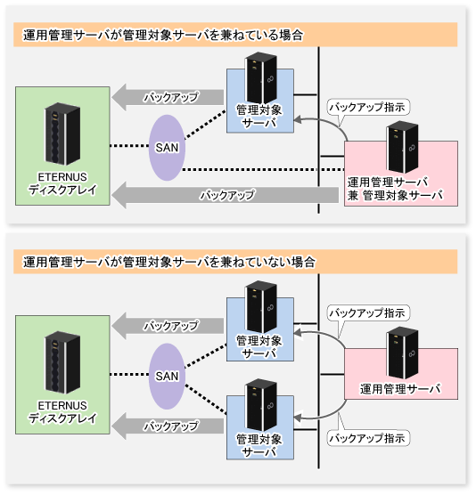 複数の管理対象サーバを一元管理、集中操作します。運用管理サーバは、管理対象サーバを兼ねることができます。