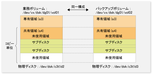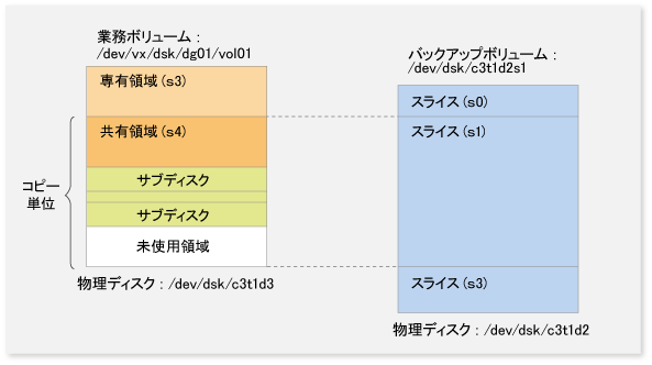 しかし、バックアップボリュームをマウントする場合やほかのアプリケーションから使用する場合を考えて、バックアップボリュームは、業務ボリュームと同一のボリューム構成を持つVxVMの論理ボリュームにしてください。