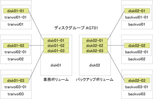 VMディスクdisk01(業務ボリューム)にはtranvol01、tranvol02、tranvol03の論理ボリュームが、VMディスクdisk02(バックアップボリューム)にはbackvol01、backvol02、backvol03までの論理ボリュームがあります。
