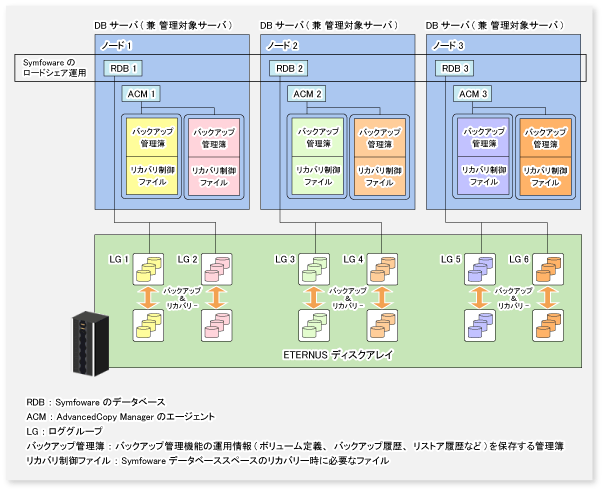 Symfowareを使用した、ロードシェア運用では、ロググループ単位で退避されたバックアップ管理簿とリカバリ制御ファイルを管理対象サーバ内のディレクトリに配置して使用するため、その配置ディレクトリを事前に設計(決定)しておく必要があります。