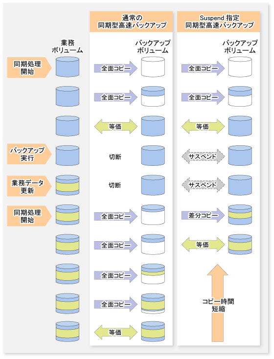 通常の同期型高速バックアップとSuspend/Resume機能を使用した同期型高速バックアップの比較を以下に示します。