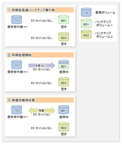 Suspend/Resume機能を使用した同期型高速バックアップ運用の流れを以下に示します。