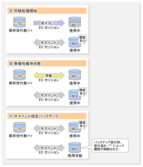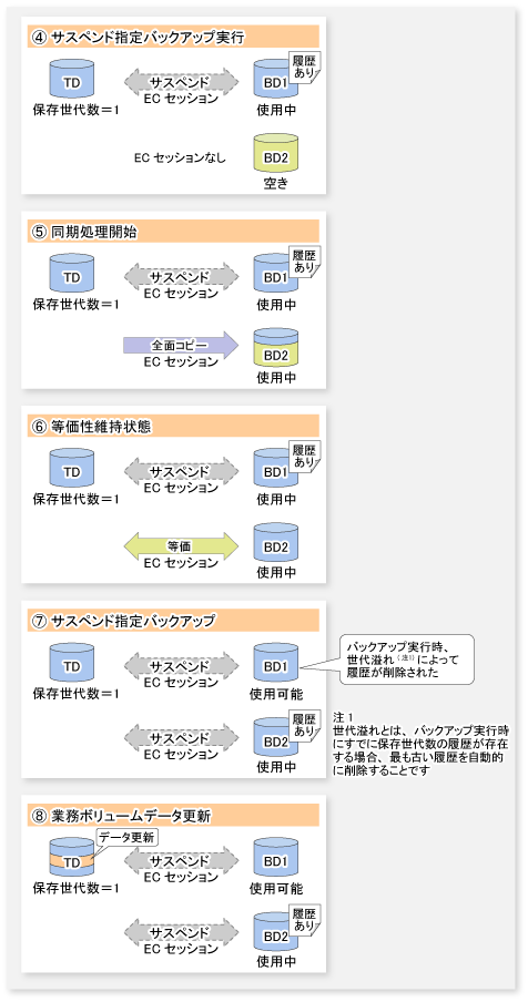 Suspend/Resume機能を使用して同期型高速バックアップするには、同期処理開始後、等価性維持状態に達したら、swstbackupコマンドをサスペンド指定で実行し、同期処理を一時停止(Suspend)します。そのあと、世代溢れや履歴情報削除によって履歴が削除されると、バックアップボリュームは履歴のないサスペンド状態になります。このとき、新たに同期処理を開始すると、履歴のないサスペンド状態のバックアップボリュームが優先的に選択され、差分コピーが開始されます。前回サスペンド時からの変更データだけをコピーするため、高速に等価性維持状態に達することができます。