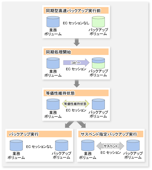 同期型高速バックアップ運用で、サスペンド指定せずにバックアップを実行すると、ECセッションは解除されます。サスペンド指定のバックアップを実行した場合はECセッションが解除されず、一時停止(Suspend)されます。