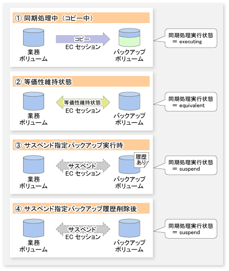 Suspend/Resumeを使用した同期型高速バックアップ運用の状況確認は、swstsyncstatコマンドで行います。このコマンドは、1つの業務ボリュームに複数のECセッションが存在する場合、すべてのECセッションの状態を表示します。表示される同期処理の状態は以下のとおりです。
