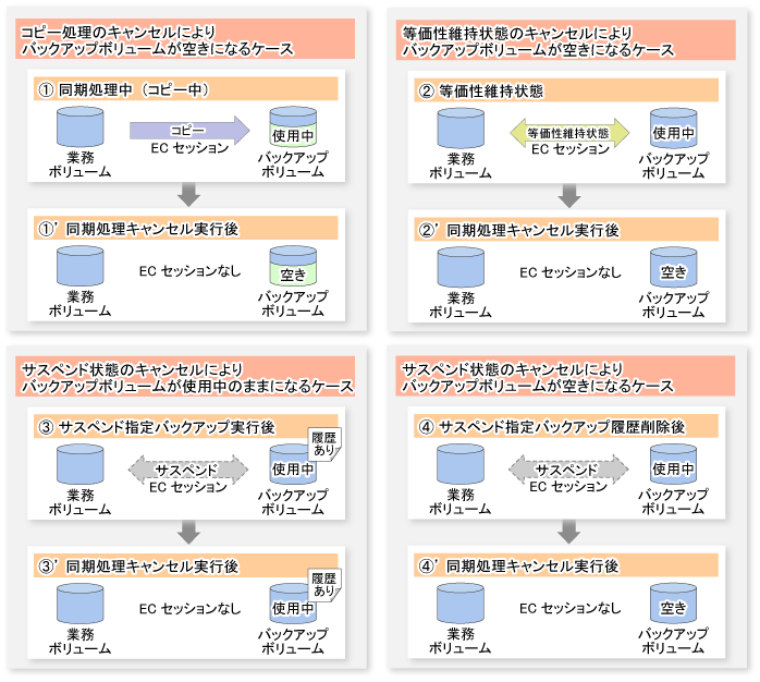履歴が存在しない同期処理 (コピー中または等価性維持状態またはサスペンド中の同期処理)をキャンセルすると、バックアップボリュームの使用状態は空きになりますが、履歴が存在する同期処理(サスペンド中の同期処理)をキャンセルすると、バックアップボリュームの使用状態は使用中のままになります。