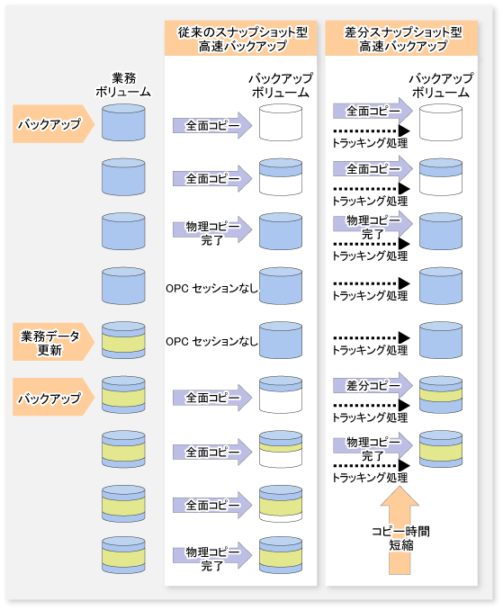 OPCを利用したスナップショット型高速バックアップでは、バックアップ(OPC)を起動するたびに業務ボリューム全体をバックアップボリュームへコピーする必要がありました。しかし、同じ業務ボリュームとバックアップボリュームのペアを使用する限り、業務ボリューム全体を毎回物理コピーする必要はなく、前回のバックアップ起動時点からの差分データだけを物理コピーすることで完全なスナップショットイメージを作成できるため、物理コピー時間を大幅に短縮できます。