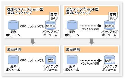 従来のスナップショット型高速バックアップと差分スナップショット型高速バックアップの履歴削除の比較を以下に示します。
