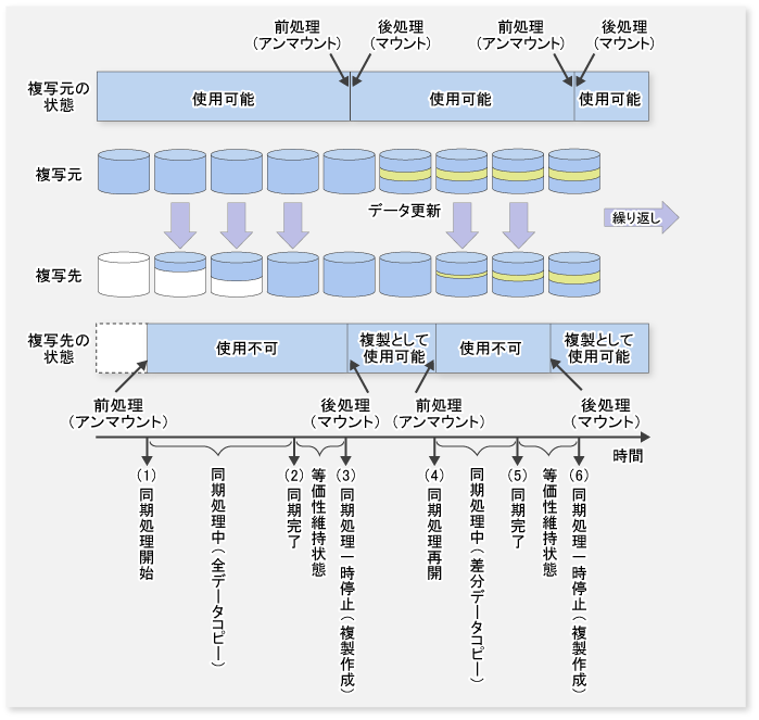 これにより複製元データを確定させます(詳細は「付録C レプリケーションの前後処理」で説明します)。複製作成コマンド実行後、複製確立状態となり、複写先ボリュームにアクセスできます。(図(3)~(4)の状態)