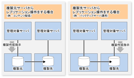 本マニュアルではレプリケーション操作を実施する管理対象サーバを“操作サーバ”と呼び、複製元サーバまたは複製先サーバのどちらかを指定します。