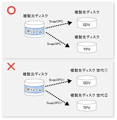 SnapOPCの複製元ディスクに対して、SDVの複製先ディスクとTPV/FTVの複製先ディスクが混在するセッションは設定可能です。一方、SnapOPC+の複製元ディスクに対して、SDVの複製先ディスクとTPV/FTVの複製先ディスクが混在するセッションは設定できません。