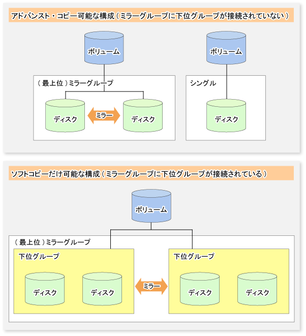したがって、下位グループが接続されているミラーグループ内のミラーボリュームに対しては、ソフトコピーだけ起動可能です。