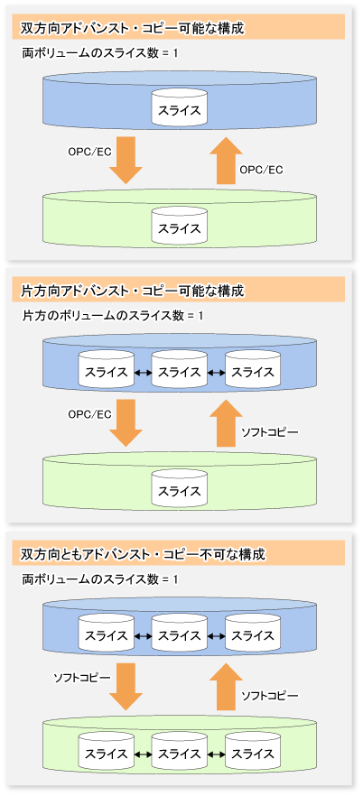 複写先ボリュームがミラーボリュームの場合は、ソフトコピーだけ起動可能です。双方向でアドバンスト・コピーを実施するには、両ボリュームがシングル構成である必要があります。