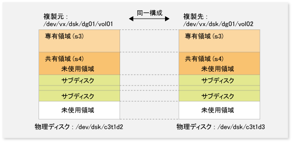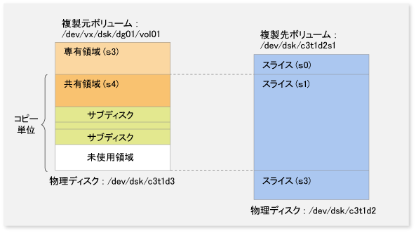 複製先ボリュームのサイズが共有領域のサイズと同一であれば、VxVMボリュームの複製先ボリュームをスライスにすることが可能です。しかし、複製先ボリュームをマウントすること、および、ほかのアプリケーションから使用することは一般的にできません。