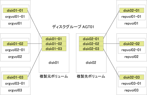 VMディスクdisk01(複製元)にはorgvol01、orgvol02、 orgvol03の論理ボリュームが、VMディスクdisk02(複製先)にはrepvol01、repvol02、repvol03までの論理ボリュームがあります。