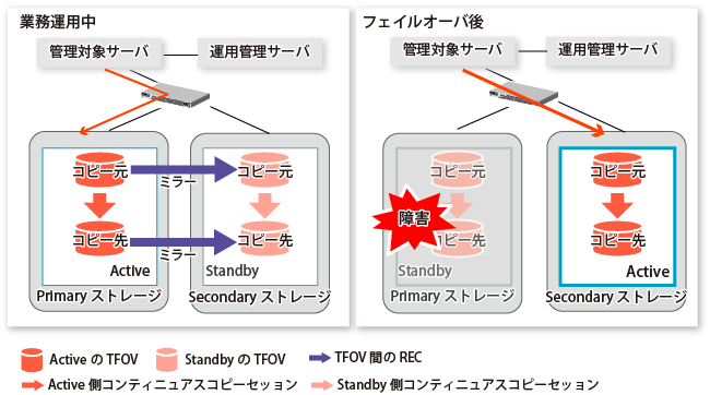 AdvancedCopy Managerでは、TFOステータスが"Active"のストレージにあるセッションを“Active側コンティニュアスコピーセッション”、TFOステータスが"Standby"のストレージにあるセッションを“Standby側コンティニュアスコピーセッション”と呼びます。